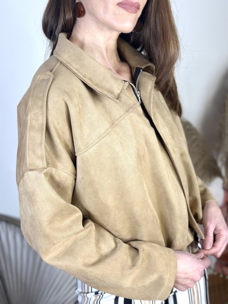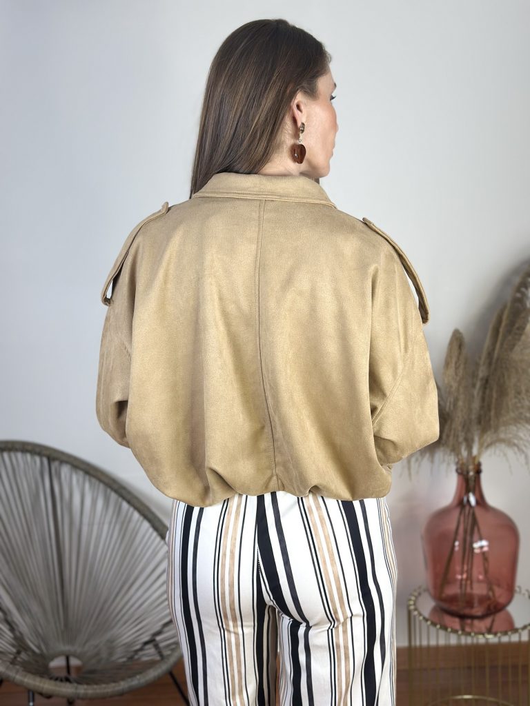 Bomber tendencia con pliegues en tejido de antelina.Cierre con cremallera con sobre solapa.