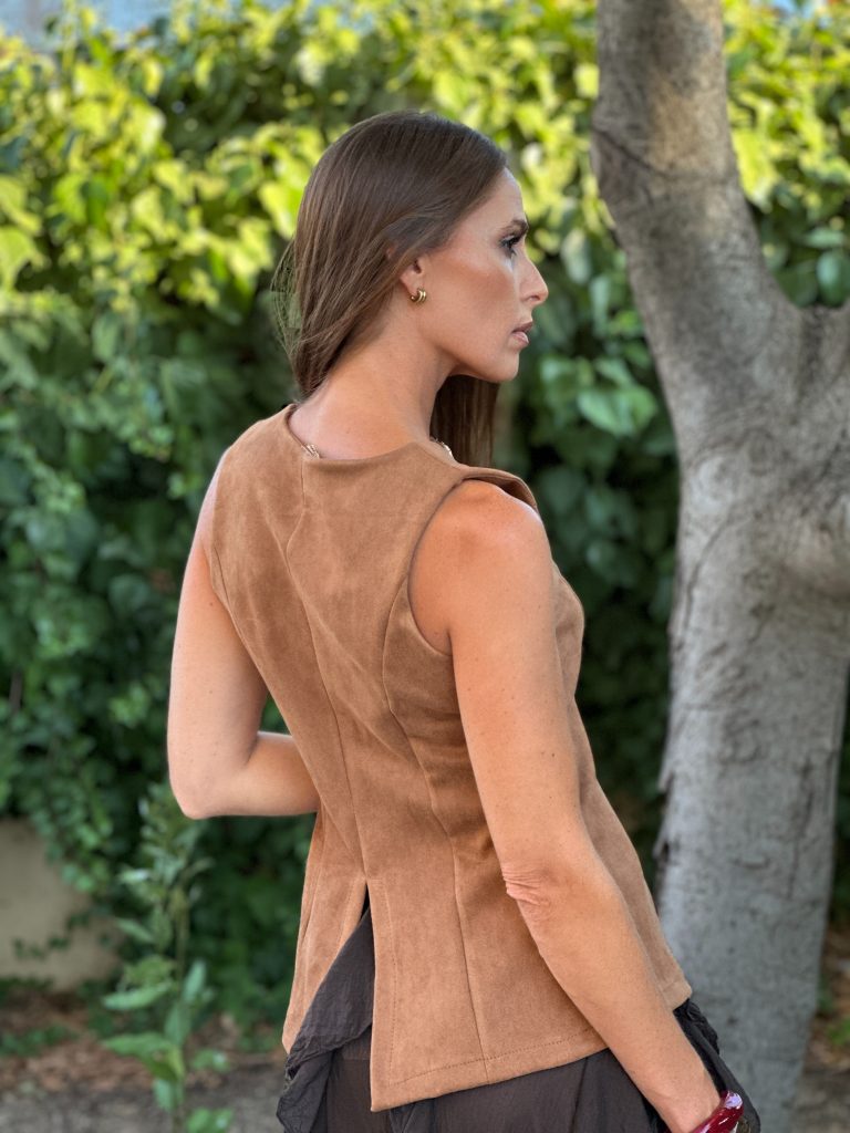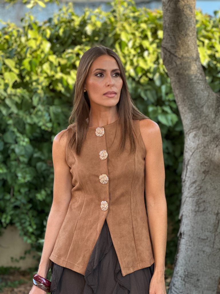 Espectacular chaleco en tejido de antelina abotonado con abertura trasera.
