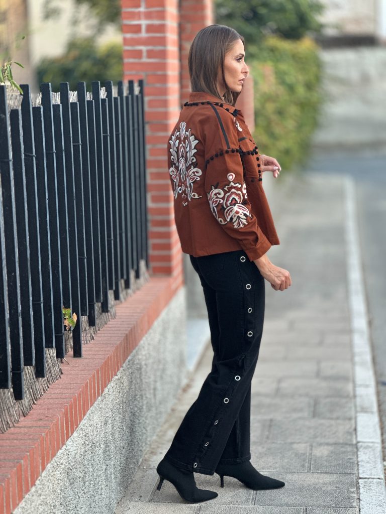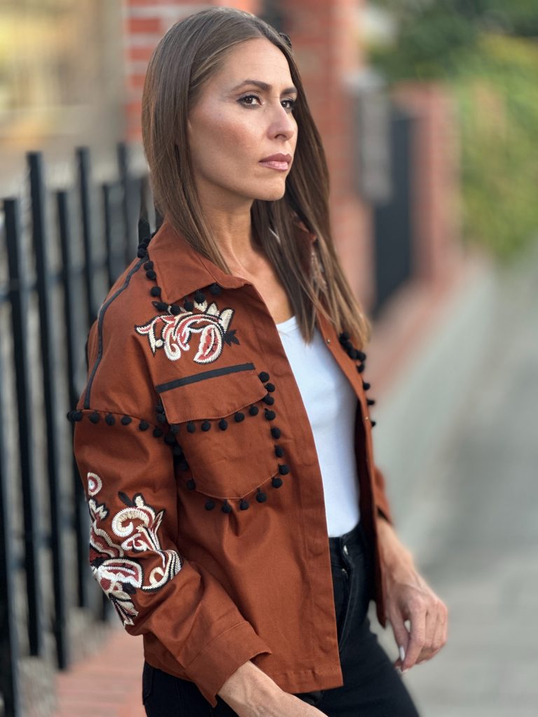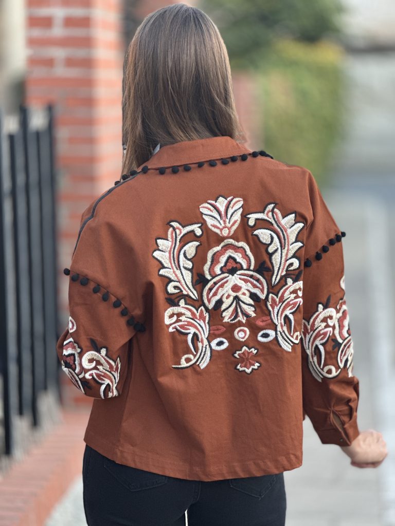 Sobre camisa con cierre abotonado y detalles de bordado y borlones.
