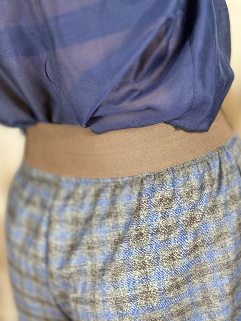 Cinturón combinado en polipiel y elástico trasero con hebilla dorada y detalles de tachas.