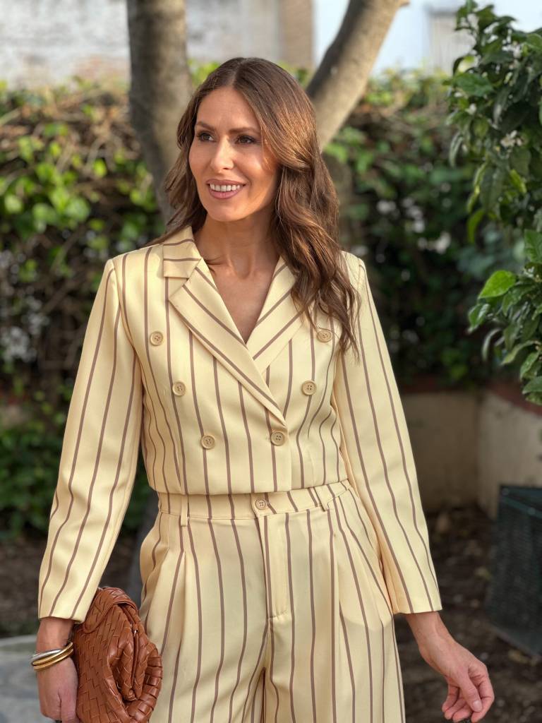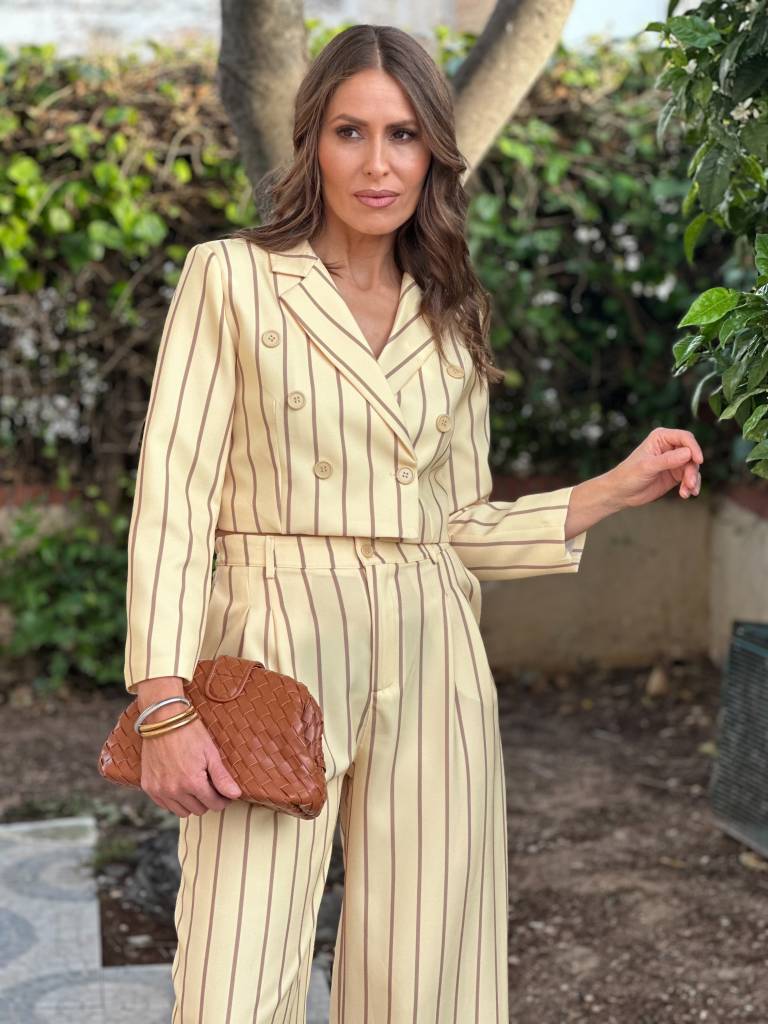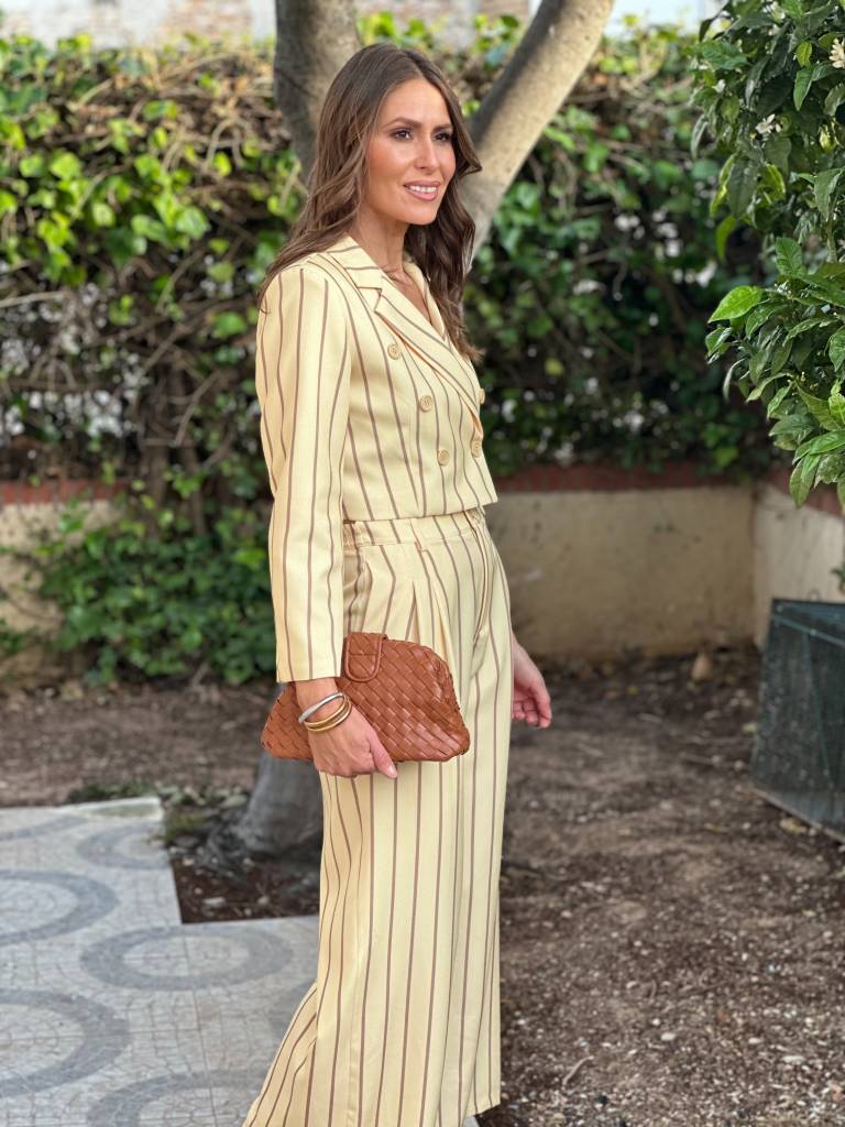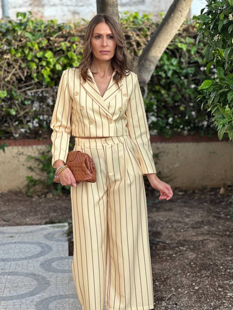 Conjunto compuesto por chaqueta Crop y pantalón recto con dos bolsillos laterales y goma en cintura trasera.