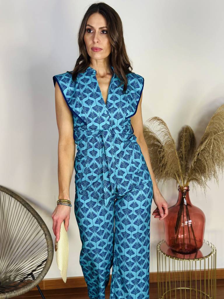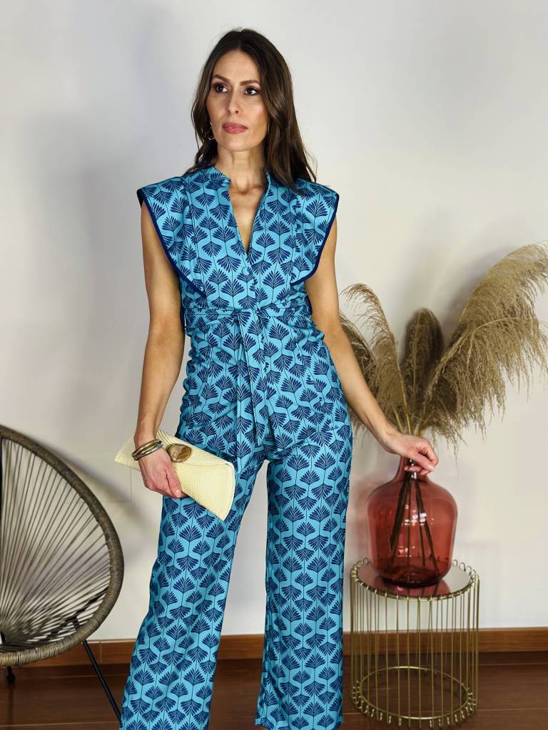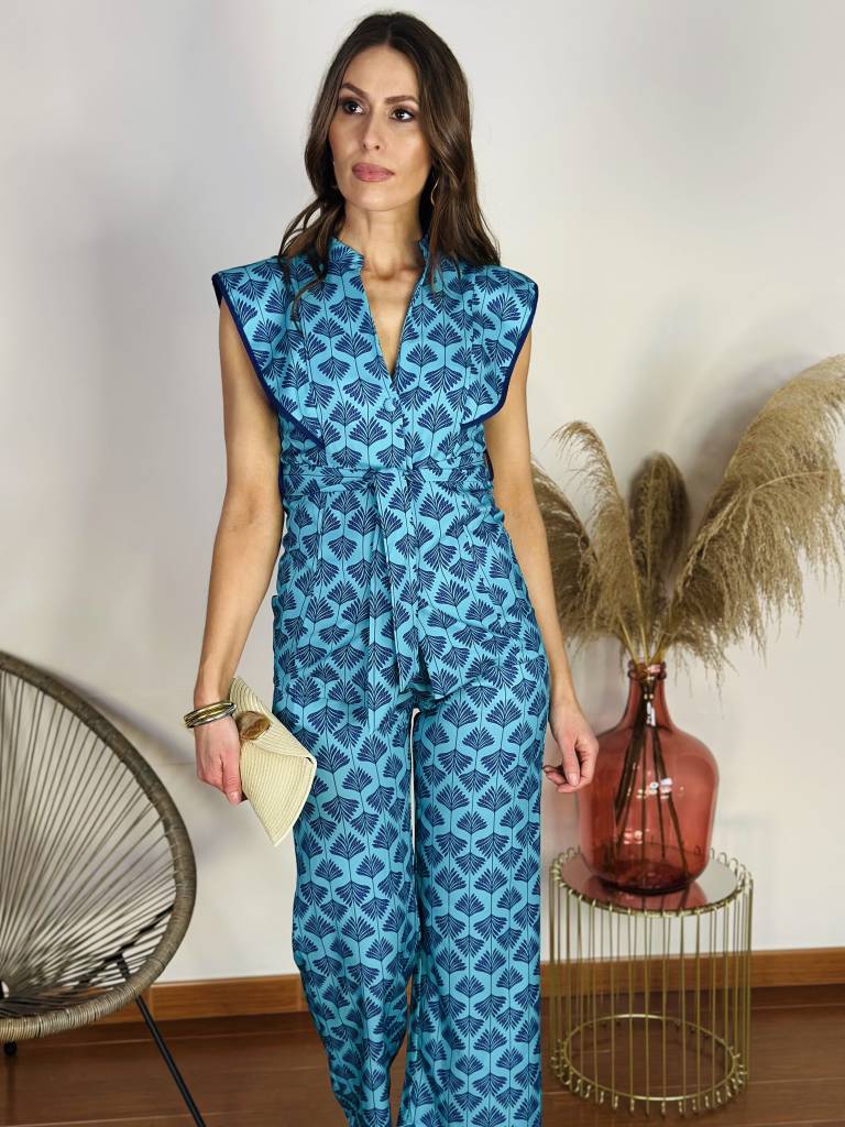 Conjunto chaqueta sin mangas cuello mao botones y lazada,pantalón recto tobillero con botón,cremallera y goma en cintura trasera.