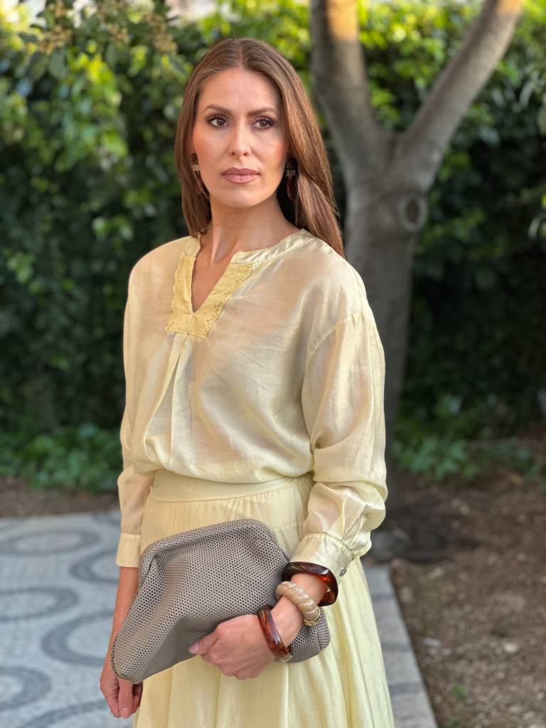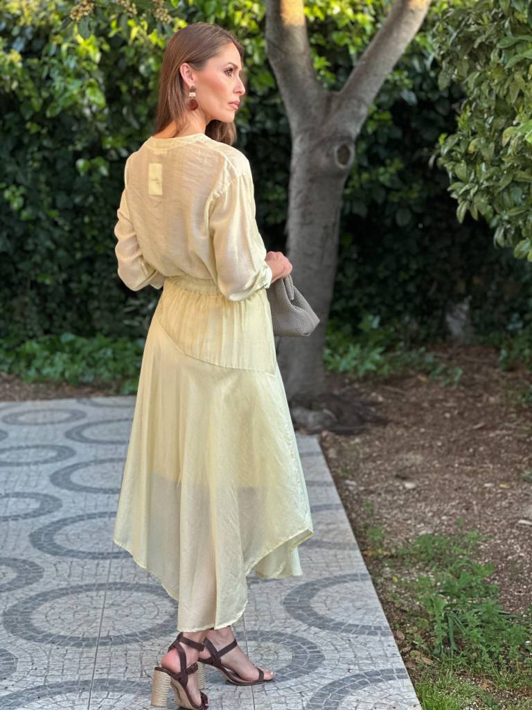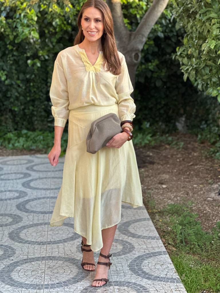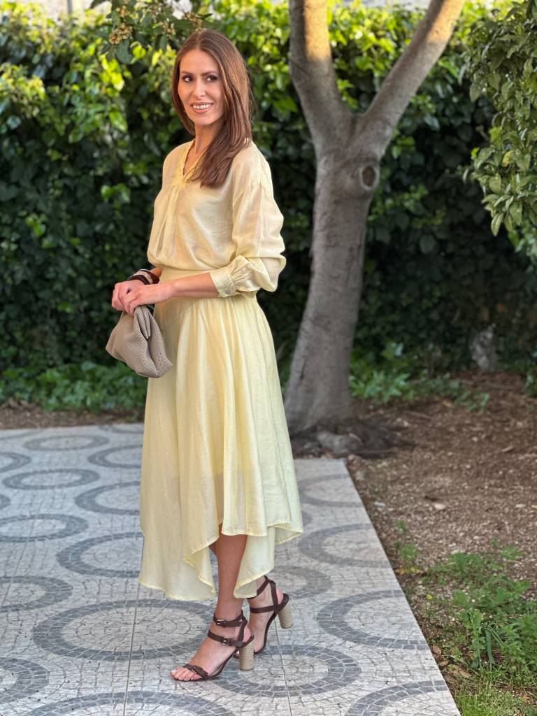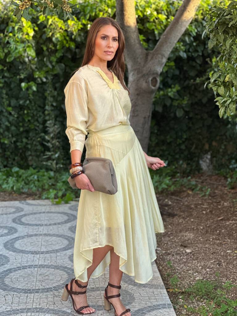 Conjunto en tejido satinado color mantequilla,falda con cintura trasera elástica.