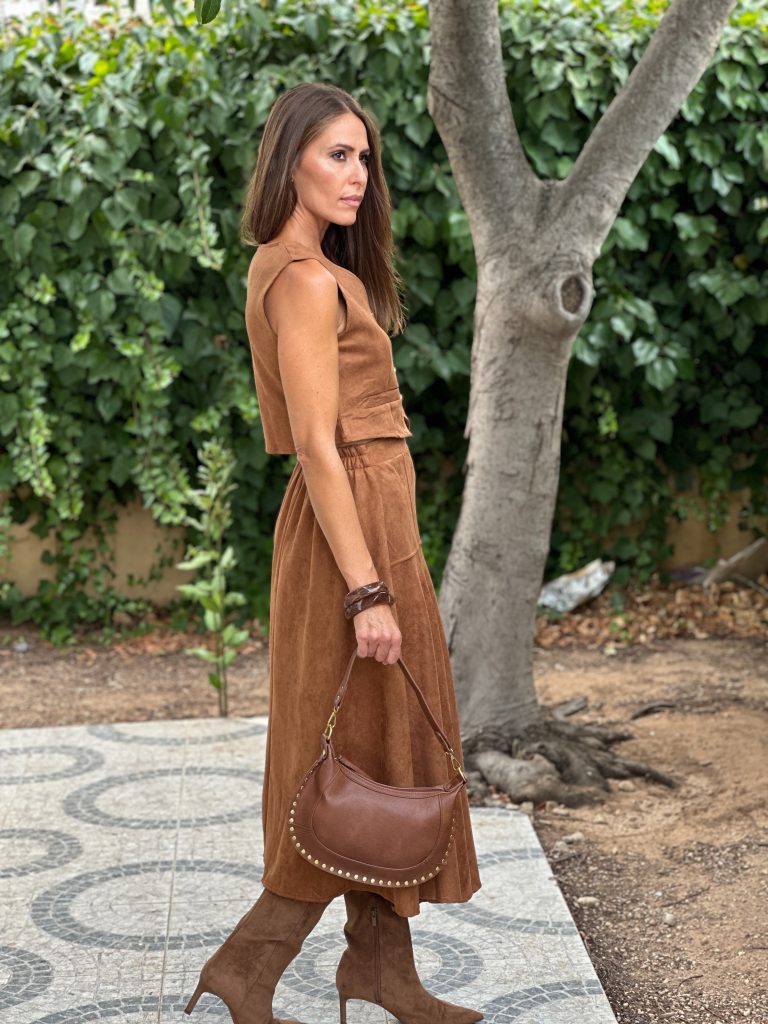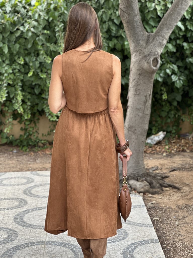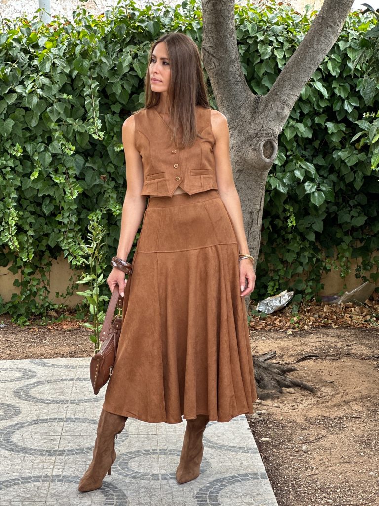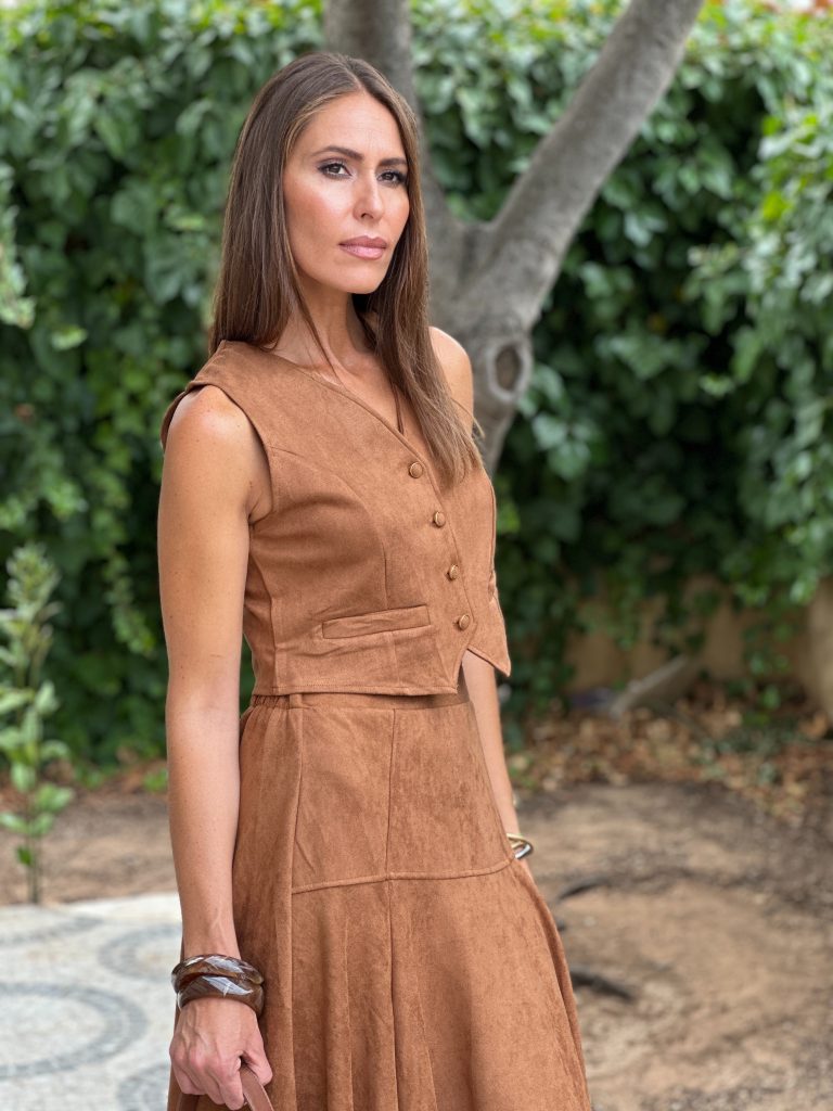 Conjunto conjunto compuesto por chaleco con cierre botones y escote pico.