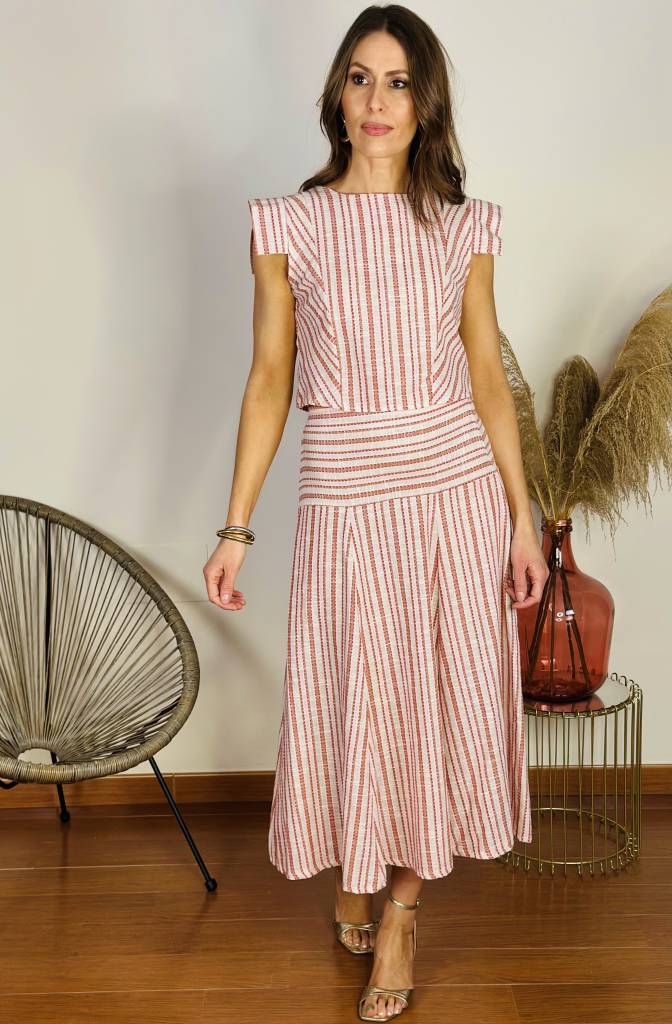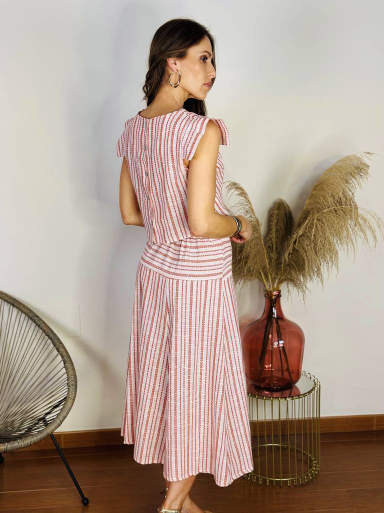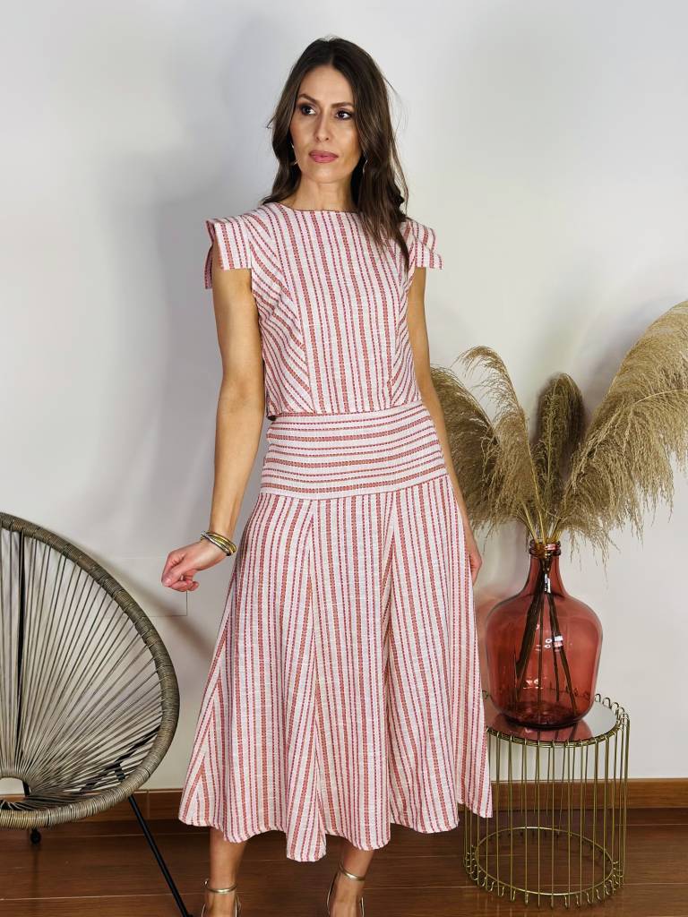Conjunto compuesto por top con botonadura trasera y falda con goma en cintura trasera.