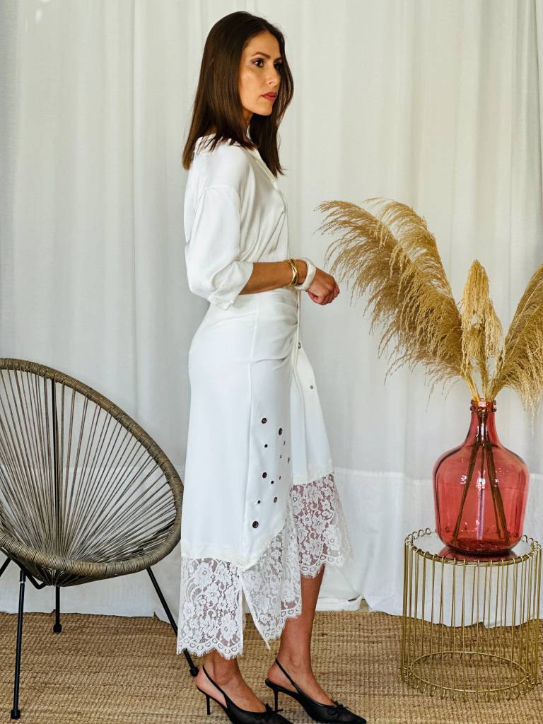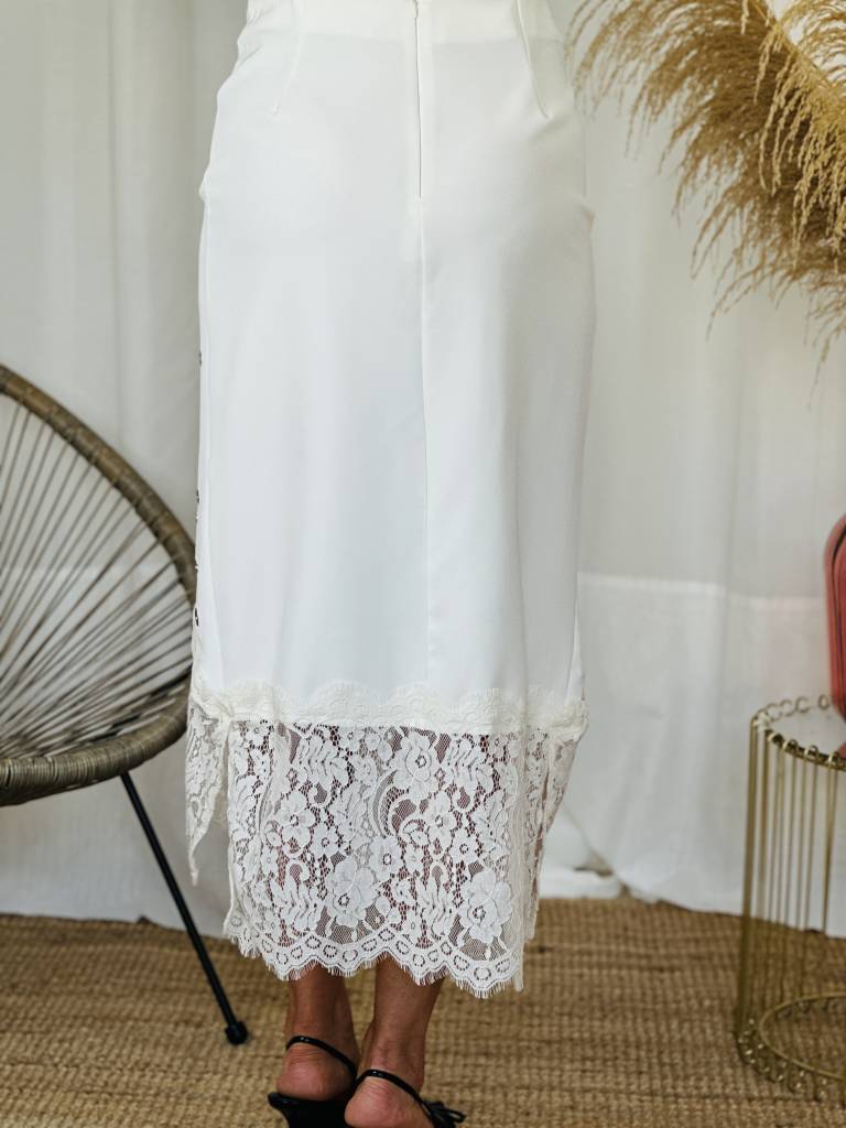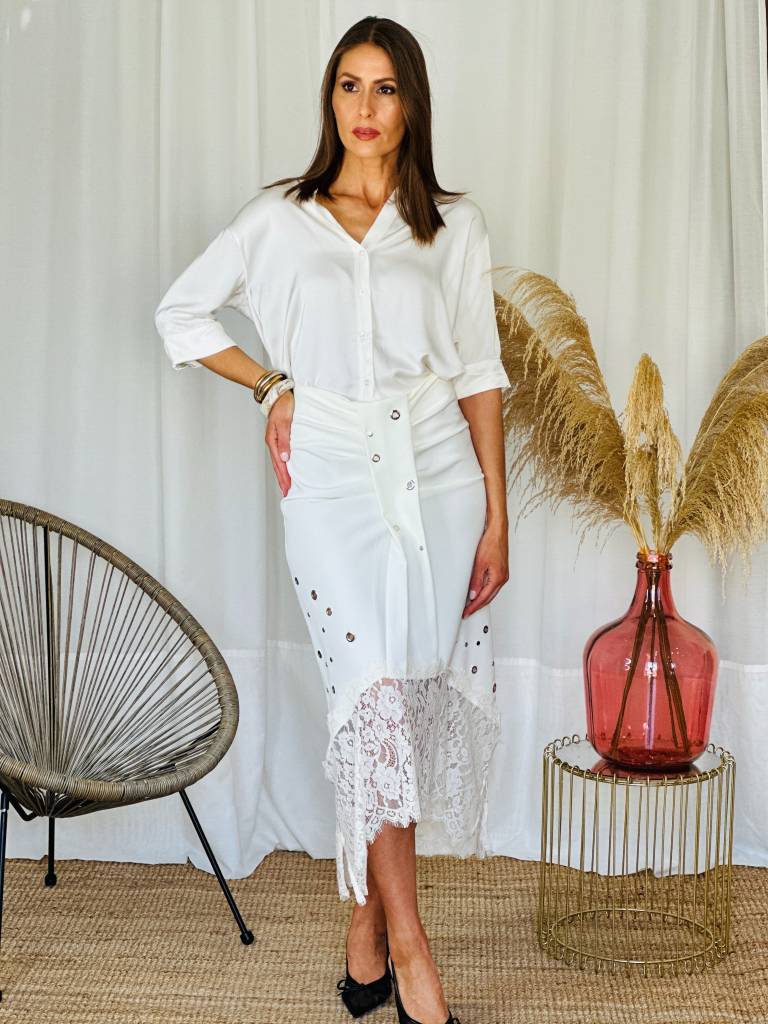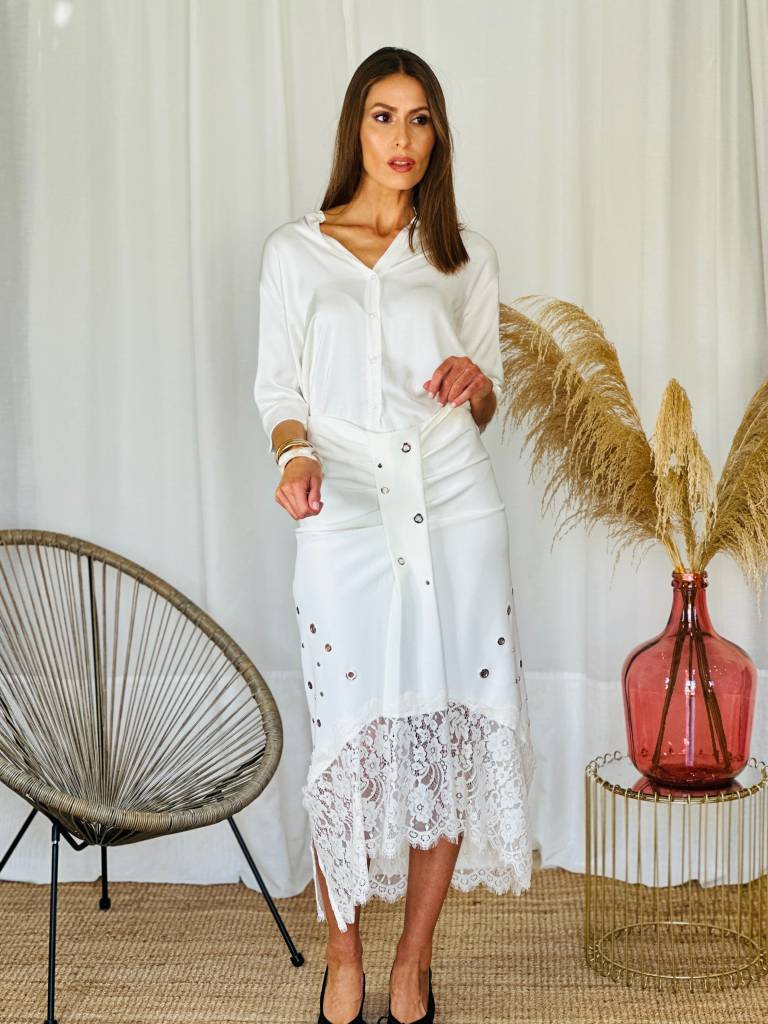 Falda midi con detalles de tachas,fruncido delantero y encaje en la parte del bajo.Cierre con cremallera trasera.