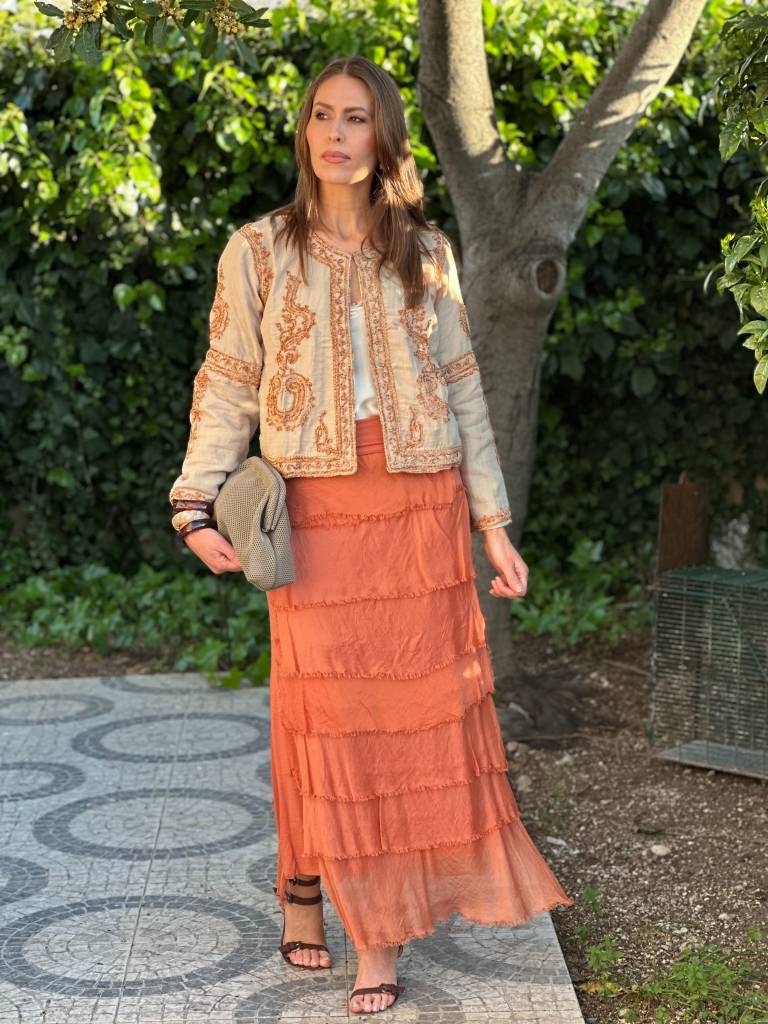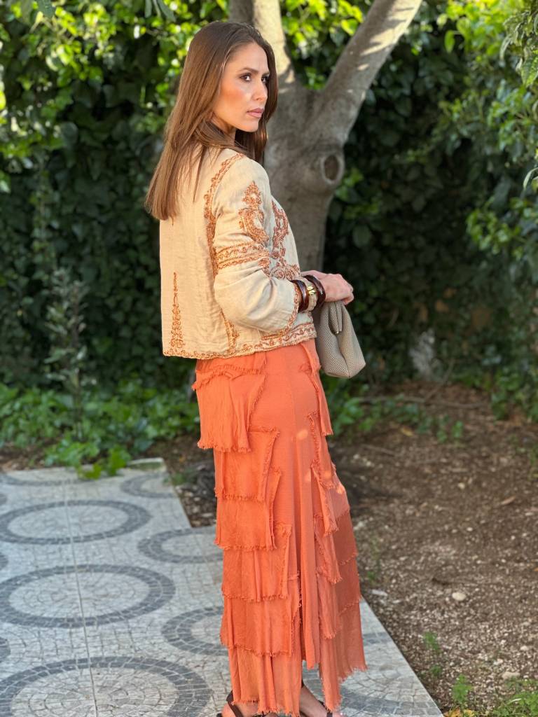 Falda en tejido de seda efecto volantes desflecados y base de algodón,cintura de algodón elástico.