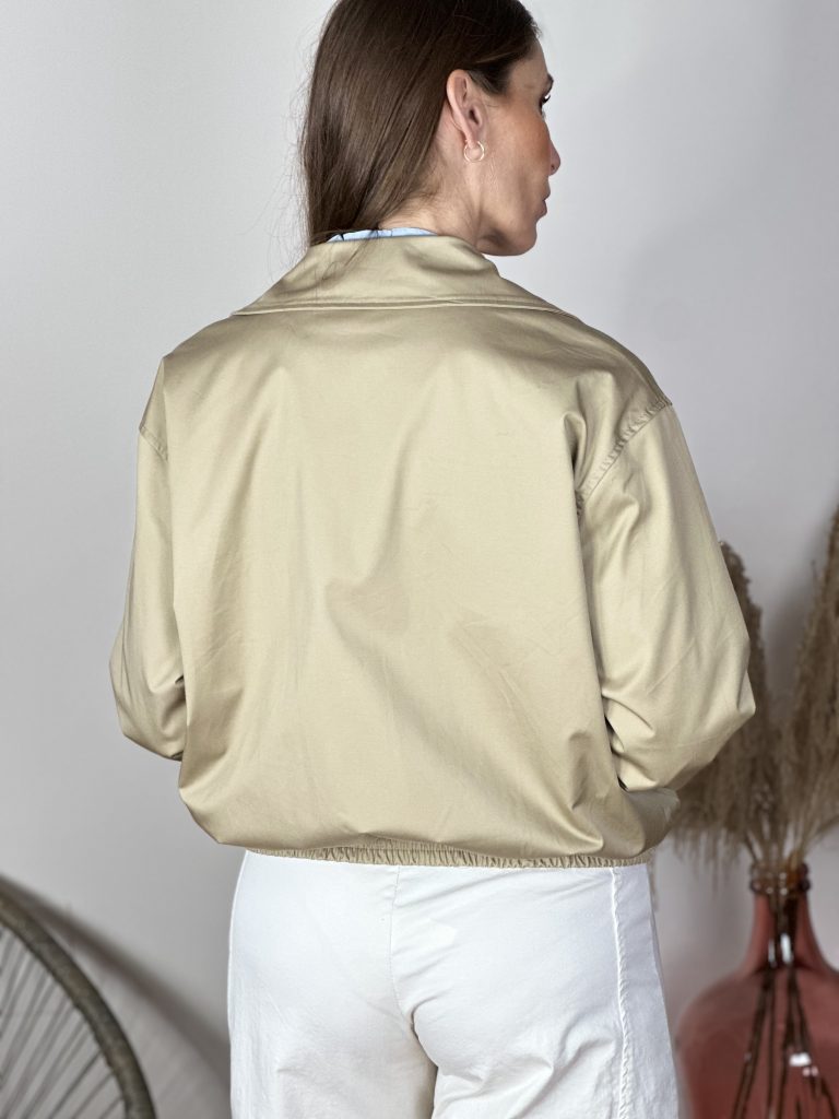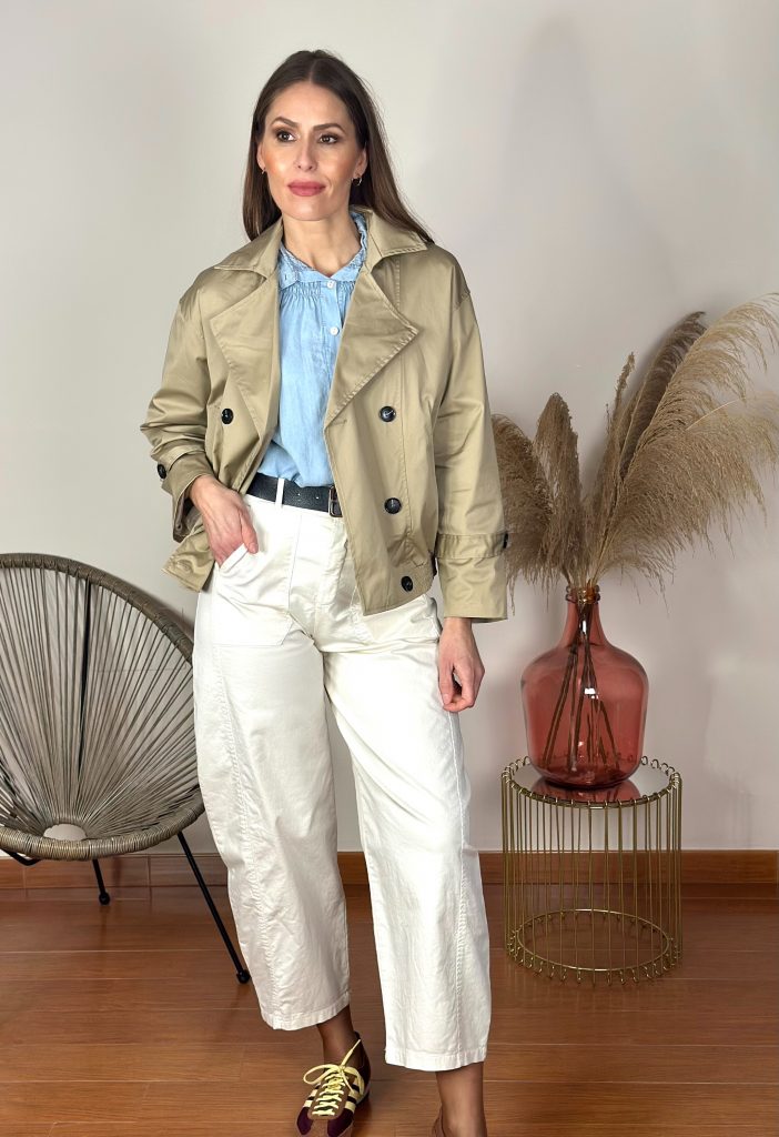 Gabardina con corte súper tendencia esta temporada,bajo trasero con elástico. Totalmente forrada.