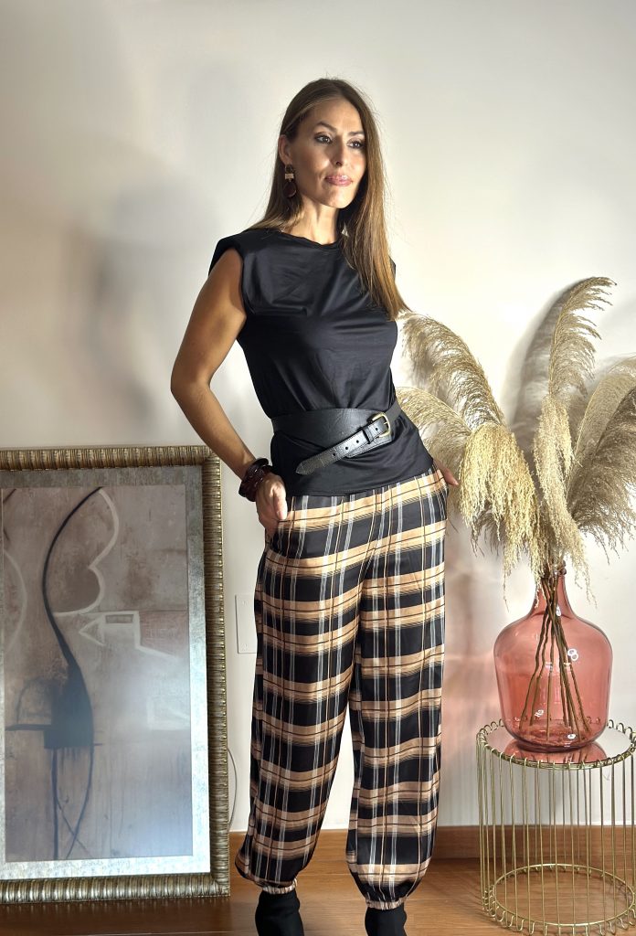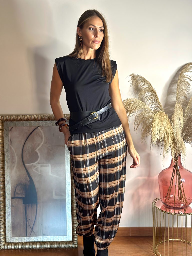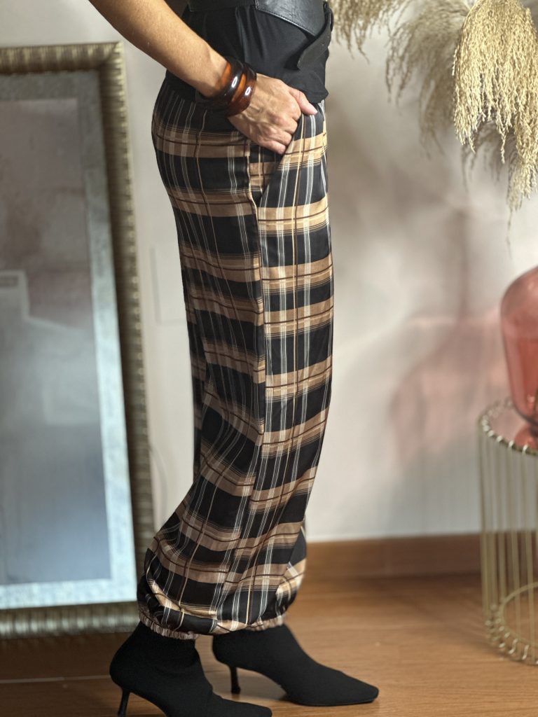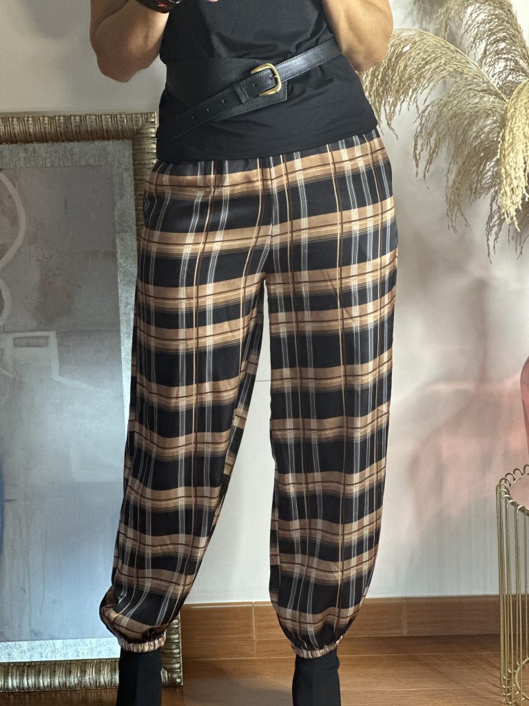 Pantalón en tejido de súper calidad con cintura de goma y dos bolsillos .