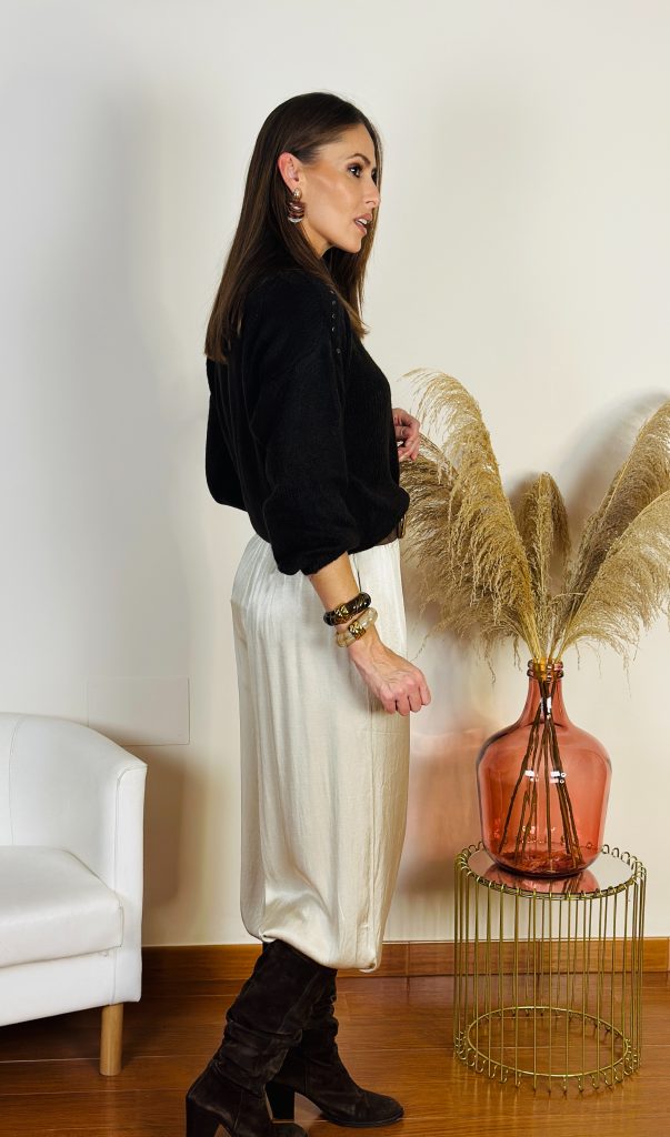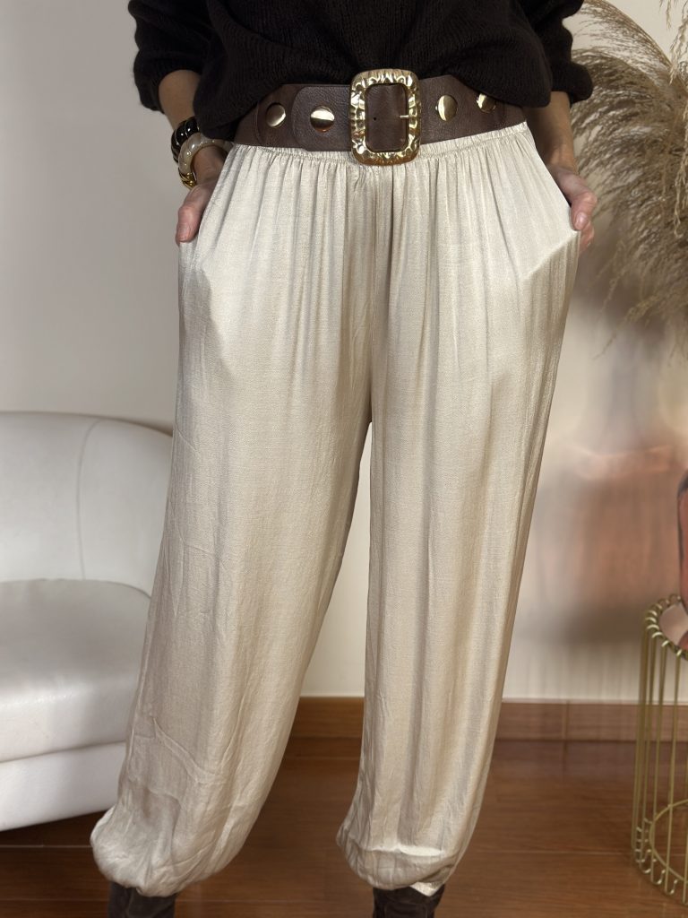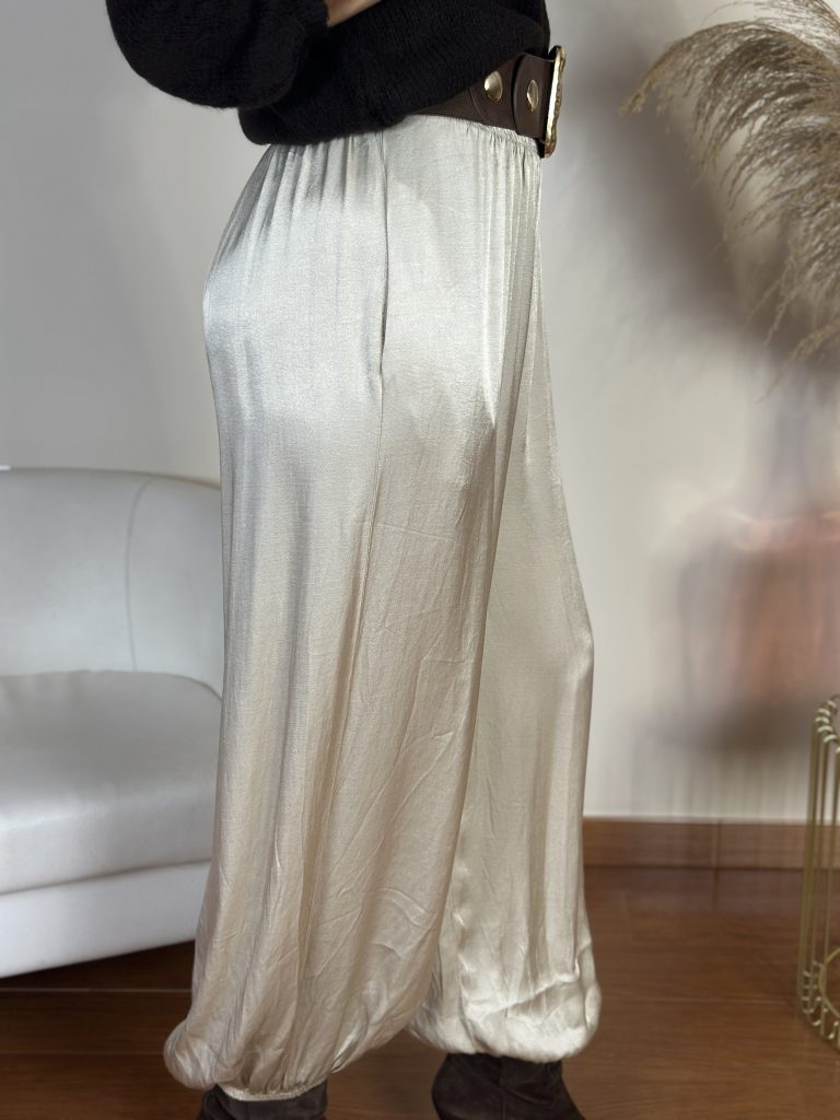 Pantalón bombacho en tejido satén con cuerpo ideal para esta temporada otoño/invierno. Cintura con goma ajustable y dos bolsillos.