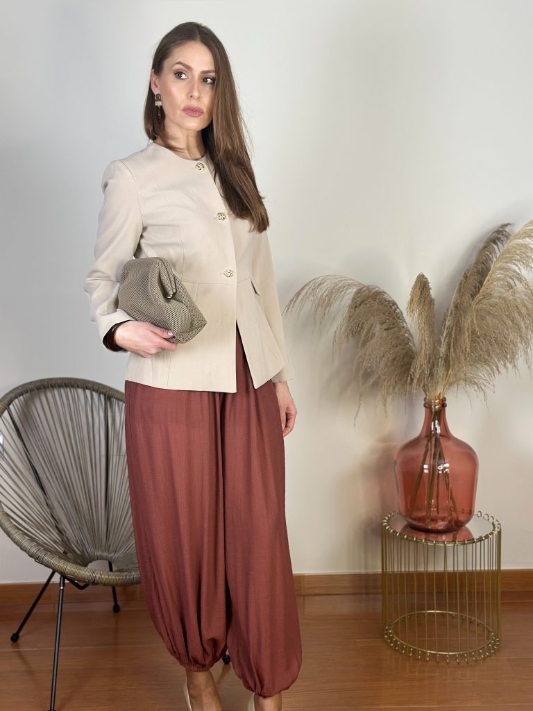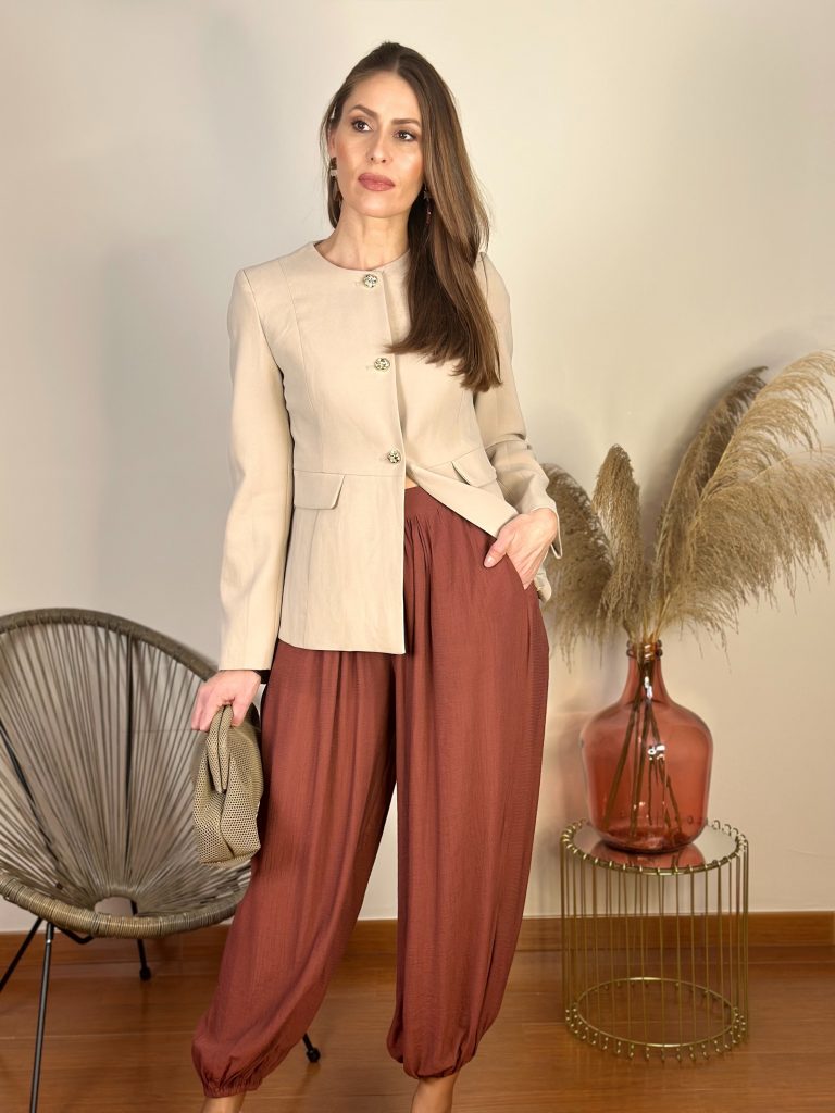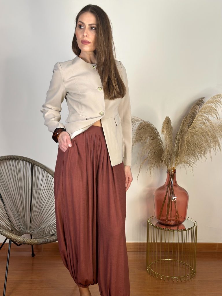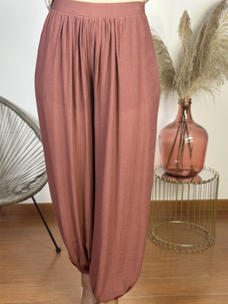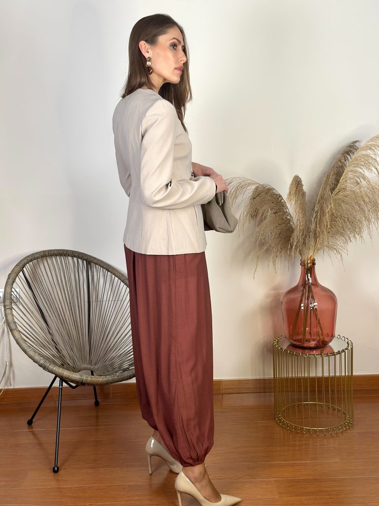 Pantalón fluido en color teja con dos bolsillos laterales,cierre lateral con cremallera y bajo adaptable con elástico.