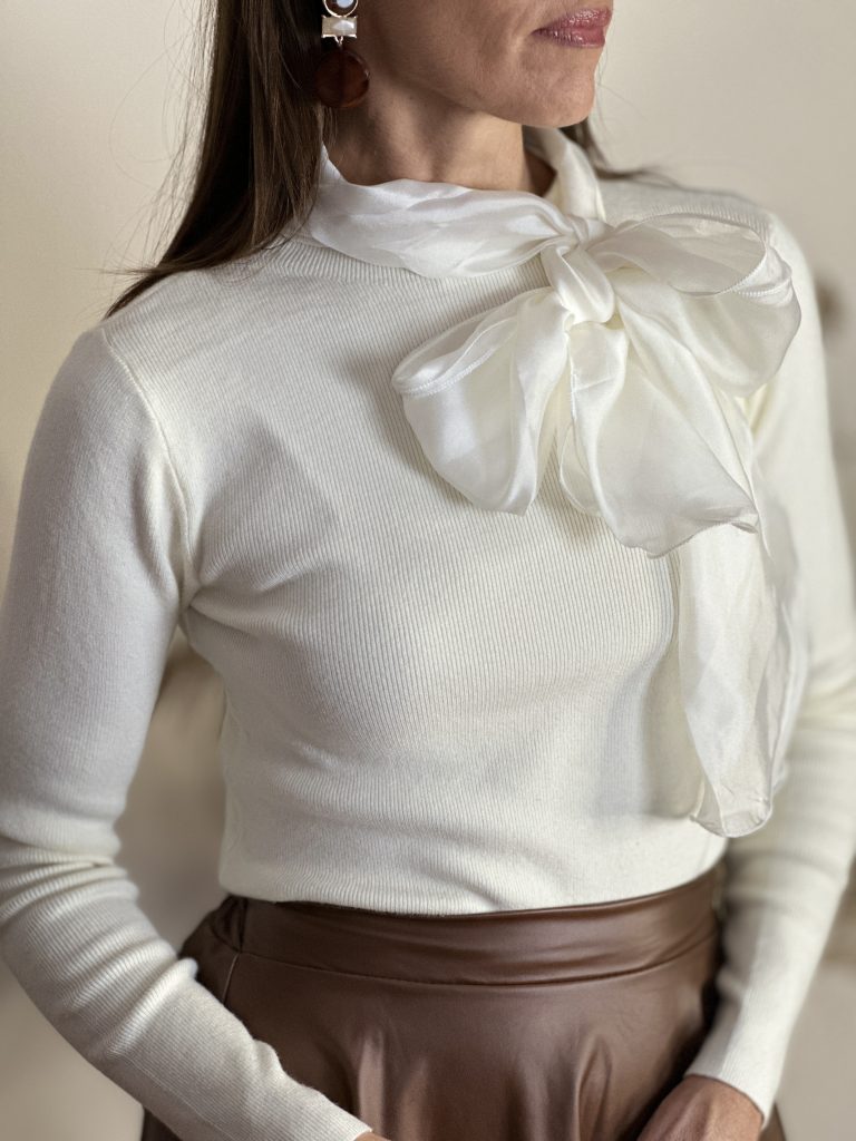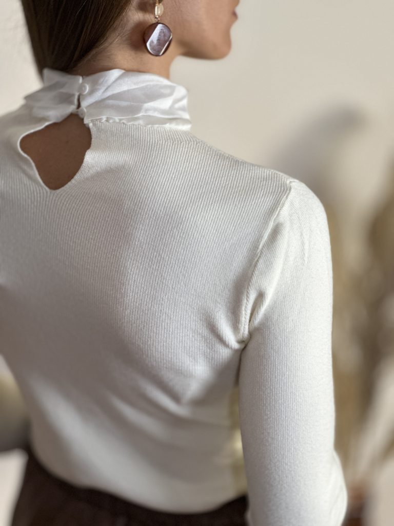 Suéter en tejido de punto canalé alta calidad y súper gustoso ( no pica nada) con maxilazada de organza. Cierre trasero al cuello con botones .